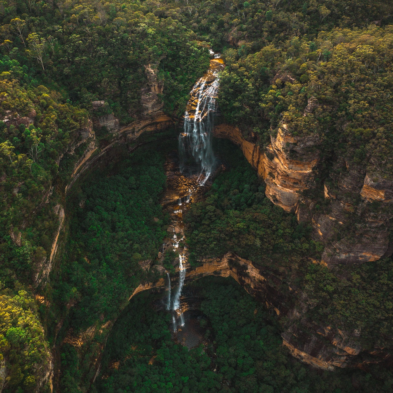 As you arrive over the Blue Mountains National Park you'll immediately notice the diverse landscape of plateaus, sandstone cliffs, and valleys, as well as a unique blue haze from the eucalyptus forest that give the mountains their distinctive blue hue. The eucalyptus trees release a fine mist of oil, which interacts with dust particles and water vapour to scatter blue short-wave length rays of light... Hence, why they're known as the Blue Mountains!